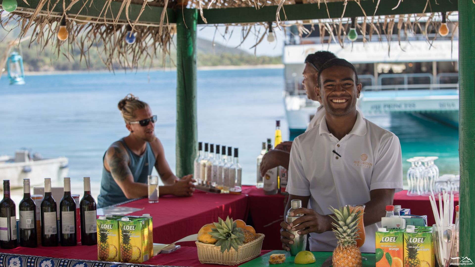Visit our beautiful private beach on Nanuya Lailai Island, on the famous Blue Lagoon, where the shipties up to a coconut tree off the beach. Spend the day on shore where you can relax in the sun loungers scattered under the palms. With kayaks and paddle boards available for your use, you can explore the surrounding waters, which are alive with colourful fish and coral, or join the crew for a fish feeding or snorkelling trip. Nestled under the trees is our 'pop-up' island bar serving refreshments and the open sand-floor bure where you can lunch.