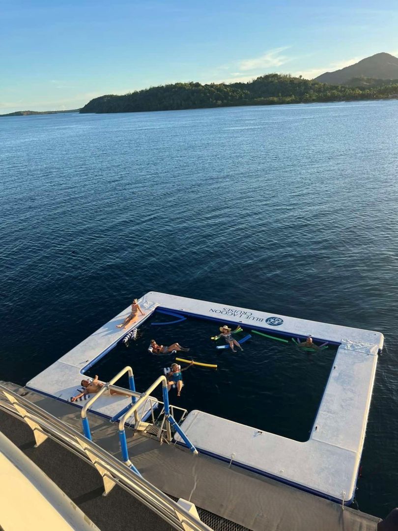 While at anchor (and it is safe to do so), our sea pool is inflated for you to lounge on or swim in.