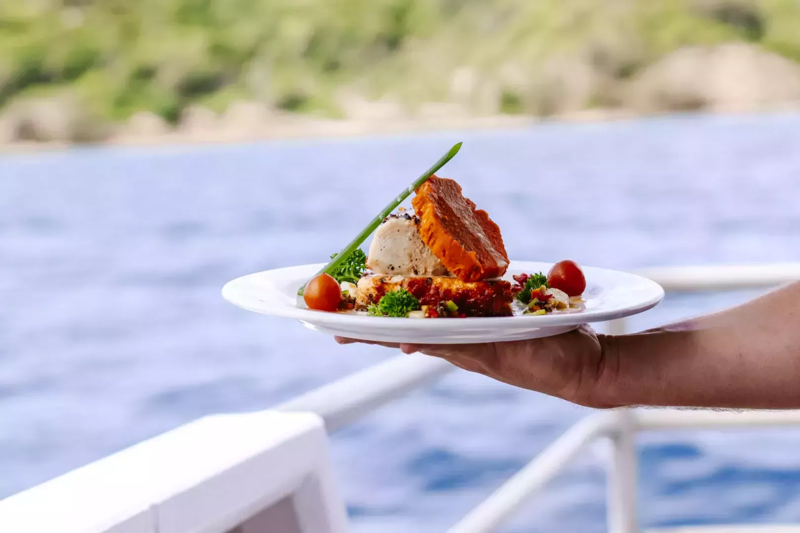 Enjoy your meals in either our light and bright dining room or on the sky deck with our cuisine being a mixture of European and Fijian styles, showcasing the best local produce. Evening meals include the à la carte Captain's Dinner, onboard themed buffets, and a Traditional Fijian Lovo (4 and 7-night cruises only), which is set on the beach at Nanuya Lailai. Your cruise fare includes daily breakfast (hot and cold options) with sparkling wine, lunch, afternoon tea, and dinner, as well as complimentary self-service tea, coffee, and filtered water (drinks available 24 hours a day).